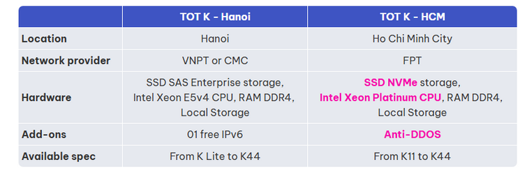 如果您在犹豫是选择熟悉的TOT K – 河内,还是尝试新的VPS TOT K – 胡志明市,请查看下面的对比表格,选择最适合您的方案。您也可以提交支持工单,申请K11、K12或K22套餐的免费1天试用。